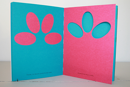 This book engages children through visual illusions….What do we see? Squares, or a star rising up in the dark sky? Ovales, or a water lily blooming on the pond? Through holes in the pages, shapes start to make sense and the story unfolds slowly as the children turn the pages. They move forward and backward, and get achievement when they can say: I understand!