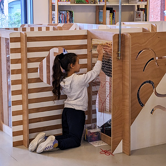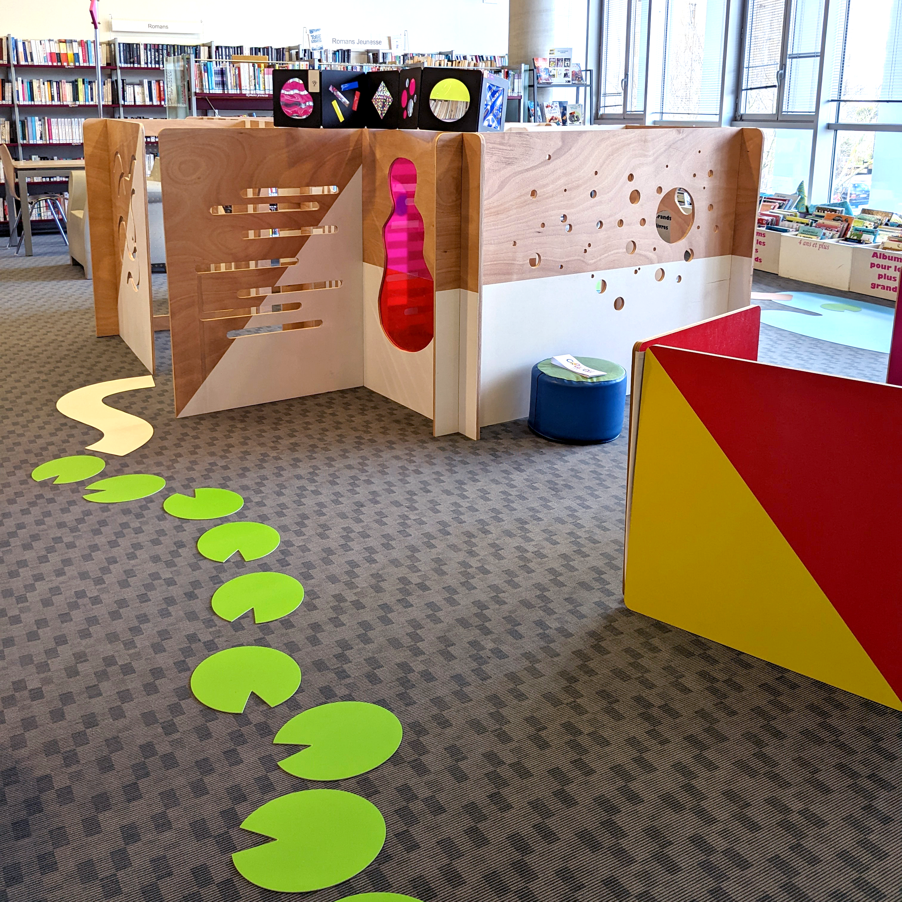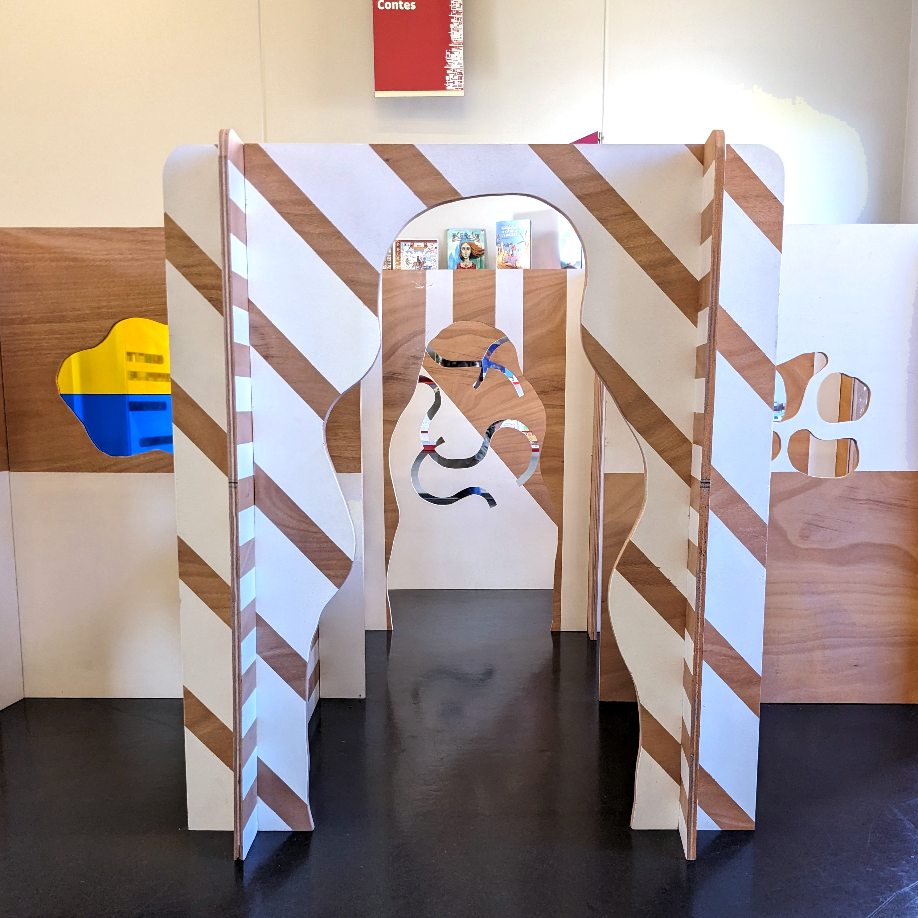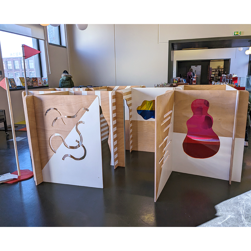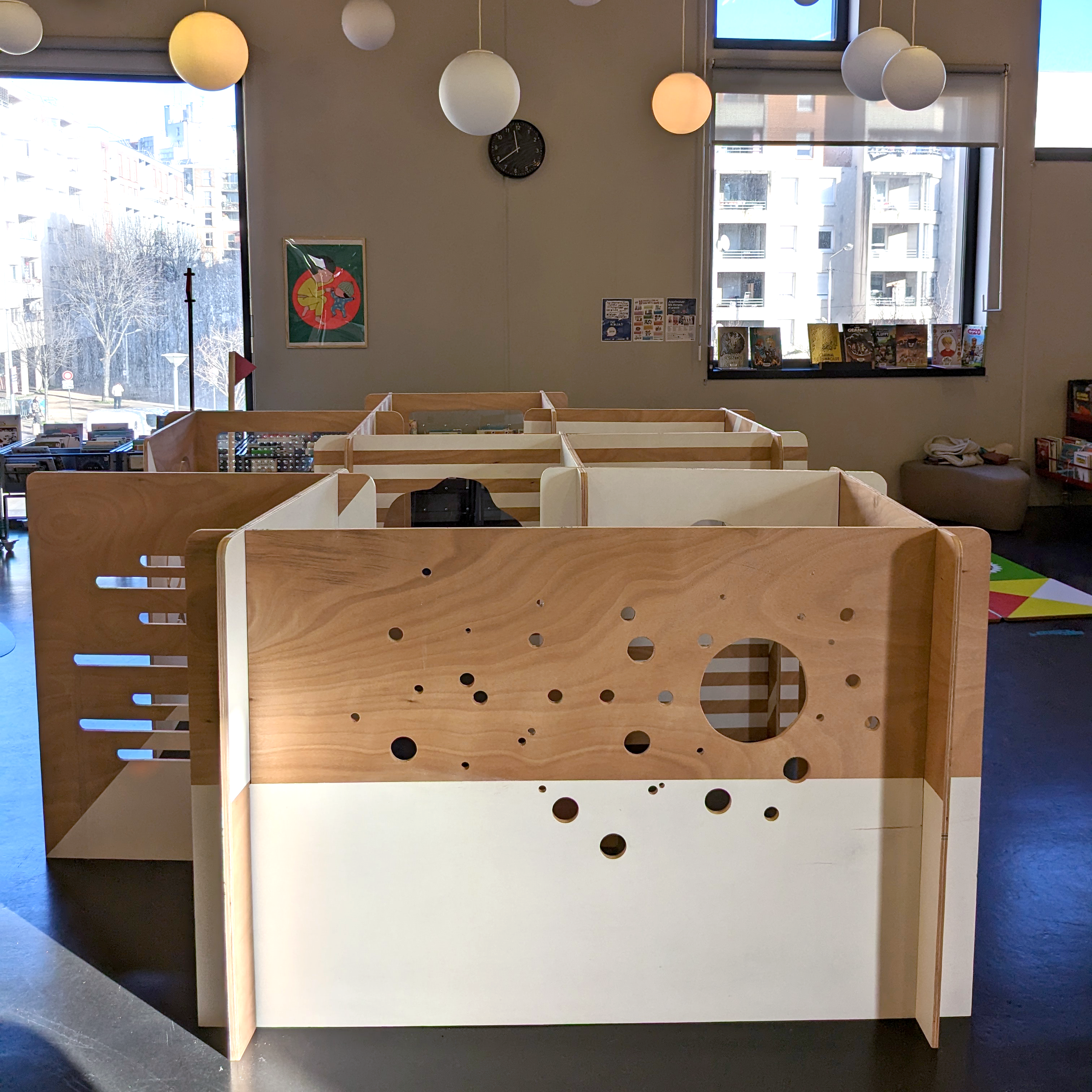 Ce module accompagne la médiation de mes livres auprès des tout-petits et leurs adultes. Il comprend un labyrinthe à coucou, des tapis-étang, des nids-paravents. L’objectif : se rencontrer ! Il y a des fenêtres pour s’apercevoir ou s’alpaguer, des coins pour se tomber dessus comme par hasard, des portes pour se rejoindre. Une grille de tissage au lacet permet de faire toue sorte de motif, mais pas tout seul ! Impossible de faire revenir le fil à soi sans l’aide de quelqu’un de lautre côté… Tout devient plus drôle et intéressant quand on est ensemble non?